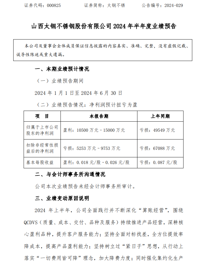 太鋼不銹(000825)7月9日晚間披露業(yè)績預(yù)告,預(yù)計2024年上半年歸母凈利潤1.05億元至1.5億元,上年同期虧損4.95億元;扣非凈利潤虧損5253萬元至9753萬元,上年同期虧損6.71億元;基本每股收益0.018元/股-0.026元/股。