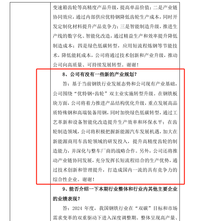 基于當前鋼鐵行業(yè)發(fā)展態(tài)勢和公司現(xiàn)有產(chǎn)業(yè)基礎,公司圍繞“優(yōu)特鋼+齒輪”雙主業(yè)實施轉(zhuǎn)型升級。在鋼鐵板塊方面,公司將著力推進產(chǎn)品結(jié)構(gòu)優(yōu)化升級,重點發(fā)展高品質(zhì)特殊鋼和高端裝備用鋼,同時加快綠色低碳轉(zhuǎn)型,通過工藝革新和設備智能化改造提升生產(chǎn)效率和環(huán)保水平;在齒輪制造領(lǐng)域,公司將積極把握新能源汽車發(fā)展機遇,加大在新能源商用車齒輪領(lǐng)域的研發(fā)投入,提升高精度齒輪的制造能力,并深化與整車廠商的戰(zhàn)略合作。另外,公司還將推動產(chǎn)業(yè)鏈協(xié)同發(fā)展,充分發(fā)揮長短流程結(jié)合的生產(chǎn)優(yōu)勢,通過技術(shù)創(chuàng)新和管理提升,打造成國內(nèi)一流的具有競爭力的綜合性企業(yè)。