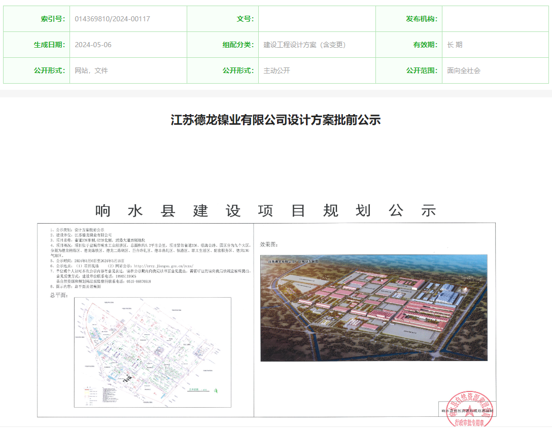 5月6日,江蘇德龍鎳業(yè)有限公司設(shè)計(jì)方案批前公示,公示時(shí)間:5月6日-5月15日。