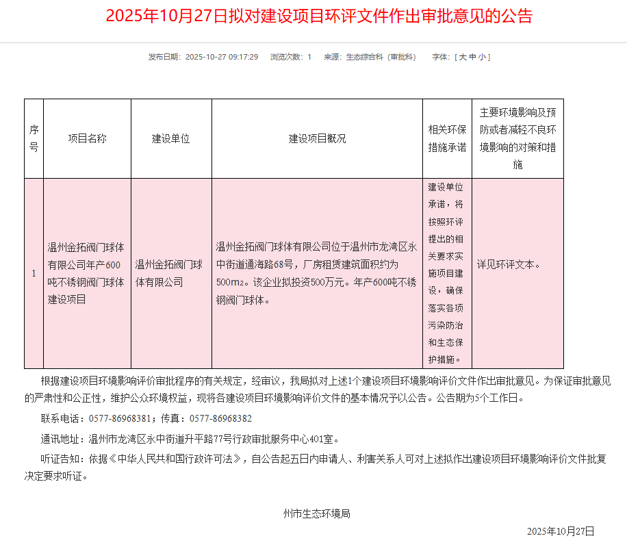 2025年10月27日,溫州市生態(tài)環(huán)境局就溫州金拓閥門球體有限公司年產(chǎn)600噸不銹鋼閥門球體建設(shè)項(xiàng)目環(huán)境影響報(bào)告表作出審批意見并對外進(jìn)行公告,公告期:5個(gè)工作日。
