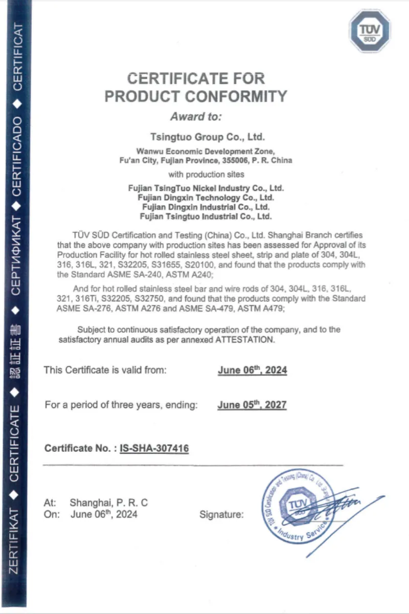 此次認(rèn)證范圍涵蓋福建青拓鎳業(yè)有限公司、福建鼎信科技有限公司、福建鼎信實(shí)業(yè)有限公司、福建青拓實(shí)業(yè)股份有限公司,產(chǎn)品包括熱軋不銹鋼卷帶、板材、棒材、盤條(牌號涉及304、304 L、316、316 L、321、316 Ti、S32205、S32750等),經(jīng)TüV南德取樣測試,認(rèn)證產(chǎn)品性能符合AS ME SA240/ASTM A240、AS ME SA276/ASTM A276和AS ME SA479/ASTM A479標(biāo)準(zhǔn)要求及產(chǎn)品性能要求。